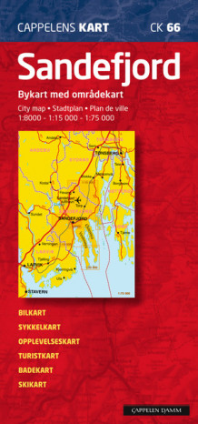 Helt nytt bykart med 3 deler: Sentrum i 1:8000 med spisesteder og enveiskjøringer. Hovedkart i 1:15 000 til Torp, Ranvik og Vesterøya. Områdekart i 1:75 000.