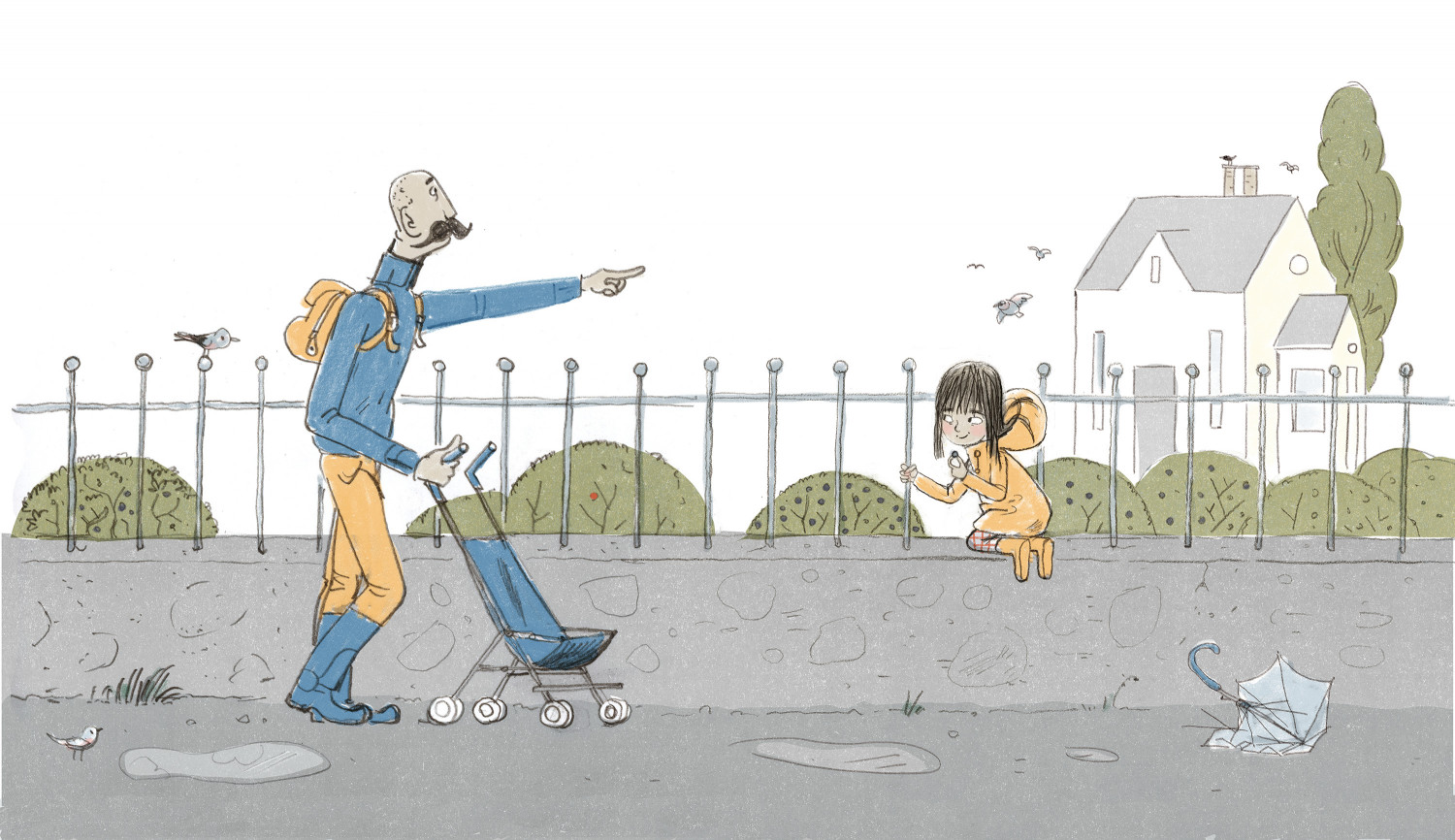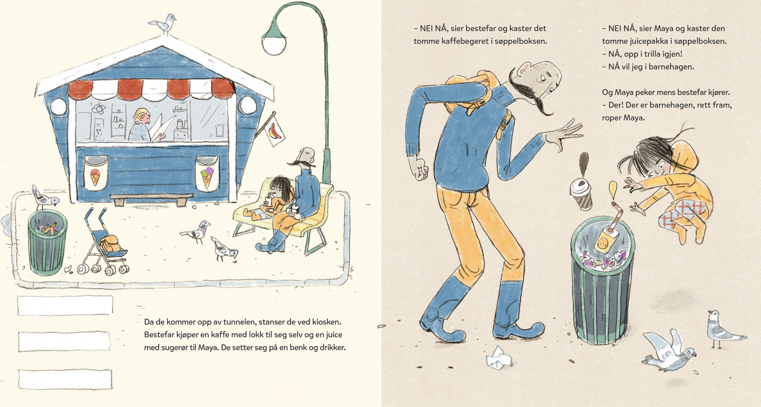 I dag er det bestefar som skal ta Maya med til barnehagen. Maya kan veien. Først går vi sånn og så sånn, sier hun og viser med armen. Det skal gå fint, sier bestefar og smiler. Han har fulgt Maya i barnehagen før. Han skal nok finne veien. Den veien, sier Maya og peker. Først går de forbi dyrebutikken, så over brua. Etterpå må de plukke epler og hilse på hestene. Det er mye som må gjøres på vei til barnehagen – særlig når det er Maya som viser veien!